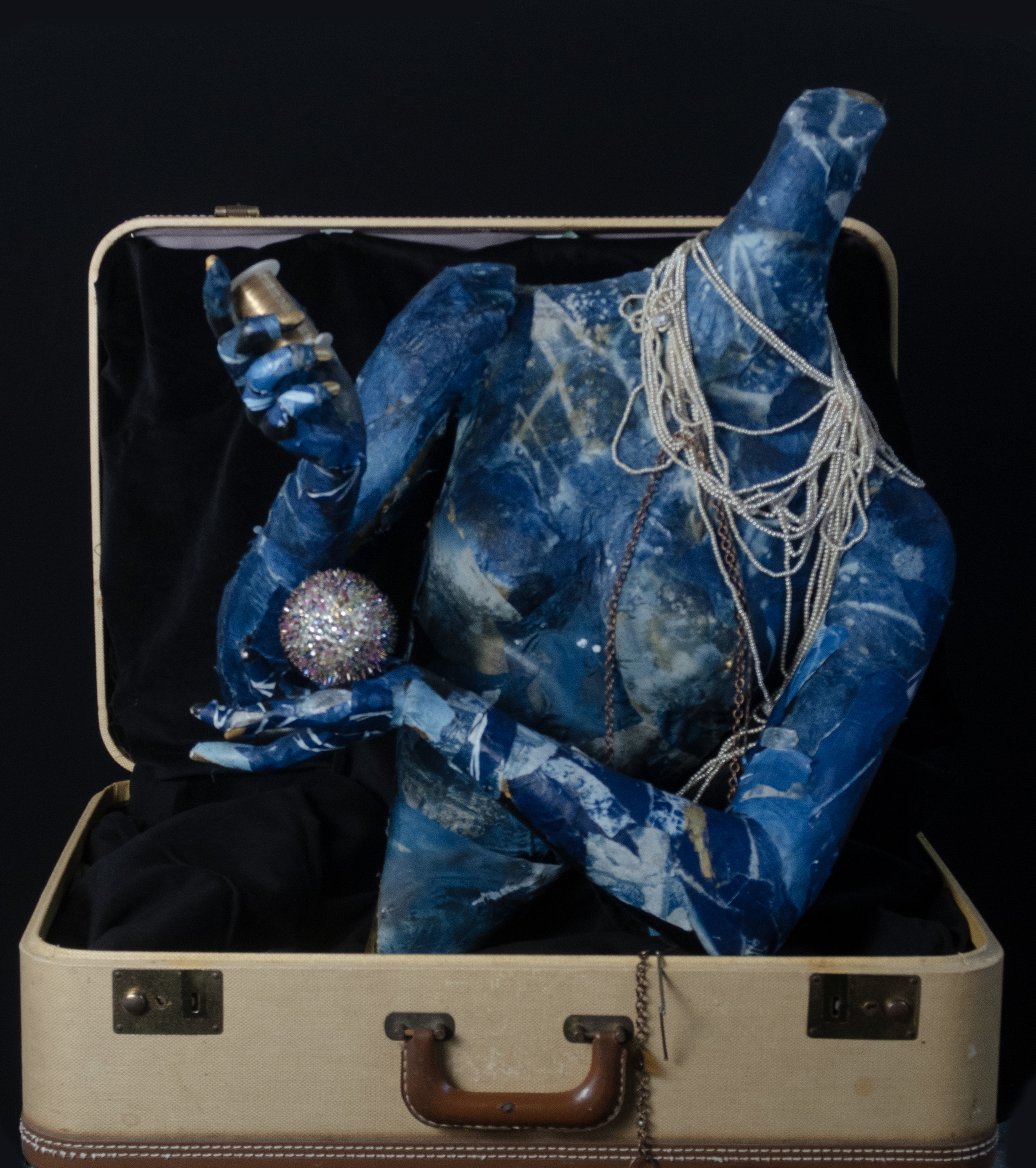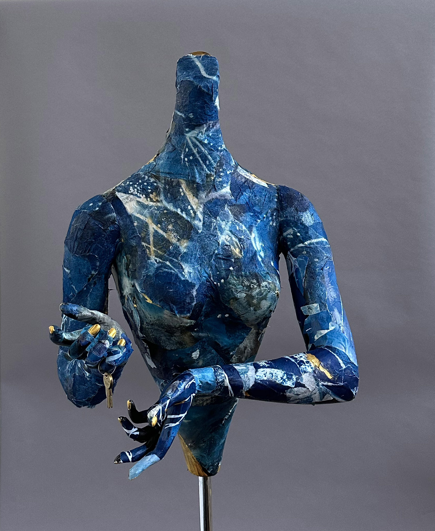 These assemblage pieces were created by collaging pieces of cyanotyped material (paper, fabric) and gluing them to a larger than life sized mannequin. I then photographed the pieces with traditional fashion lighting.